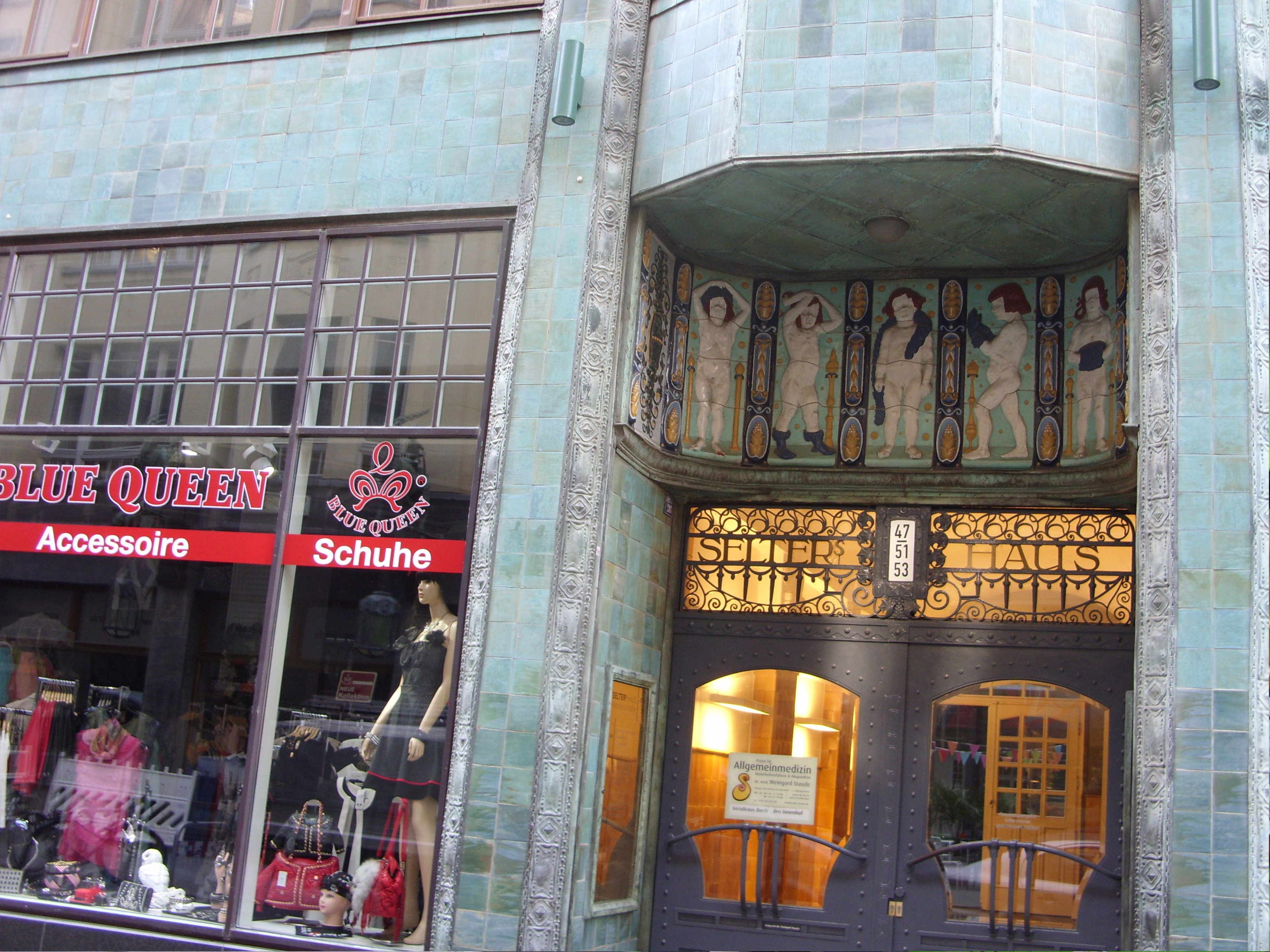 Bitte achten Sie zwischen den Schaufenstern auf unsere historische Eingangstür mit dem Hauseingang Nikolaistraße 47-51 und 53.